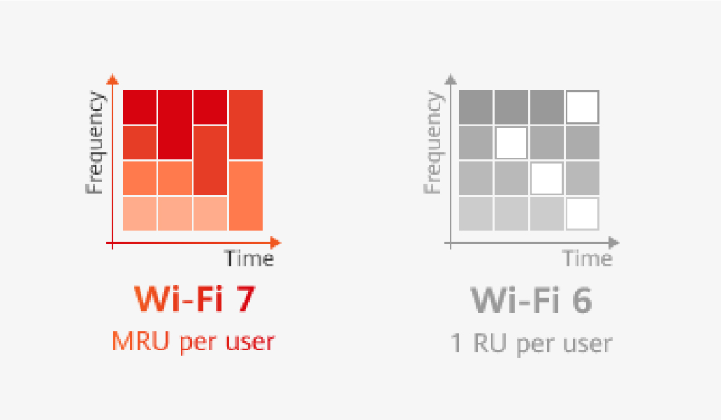 Wi-Fi 7では1ユーザに対して複数のRU(リソースユニット)を柔軟に割り当てられるため、より効率の高い通信が可能です。これにより、複数のクライアントが接続する環境でも低遅延を維持しやすくなります。