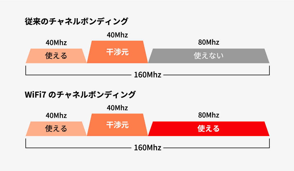従来の Wi-Fi では干渉があるとチャンネルを丸ごと利用できず、実際にはプライマリチャンネルのみで通信するため帯域が制限されていました。