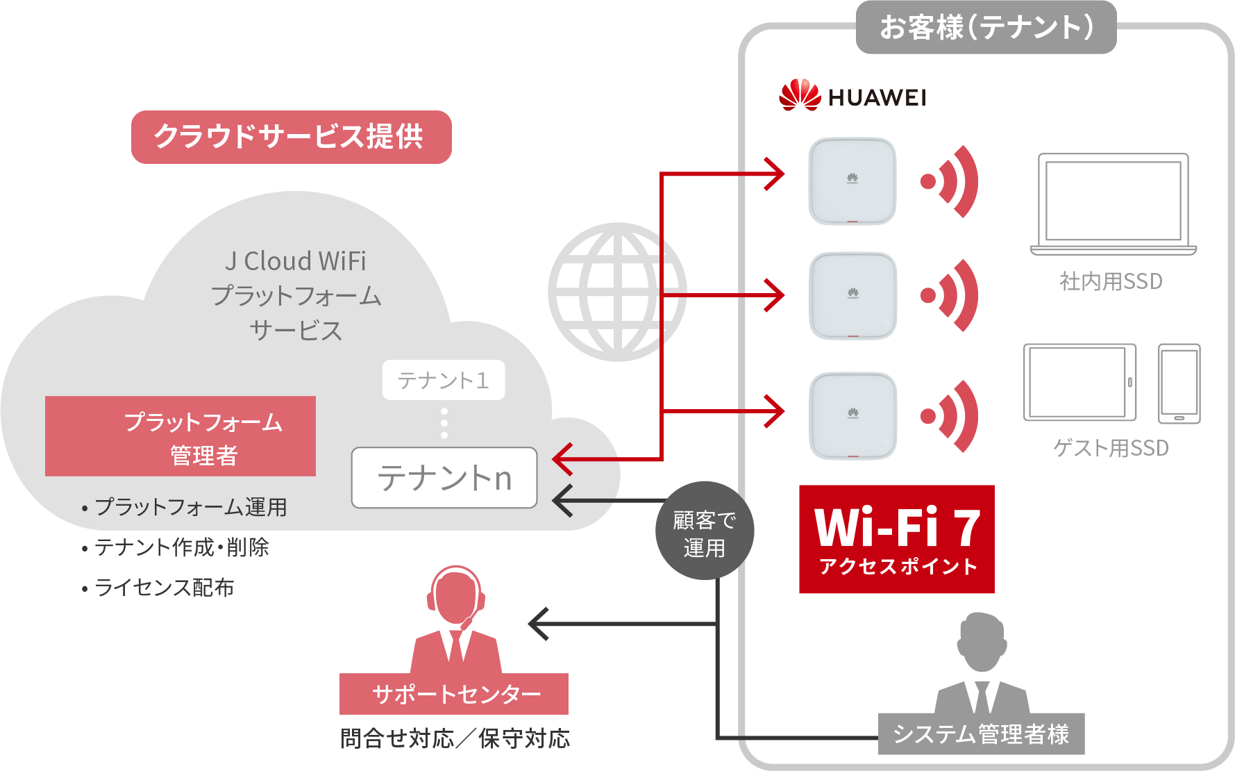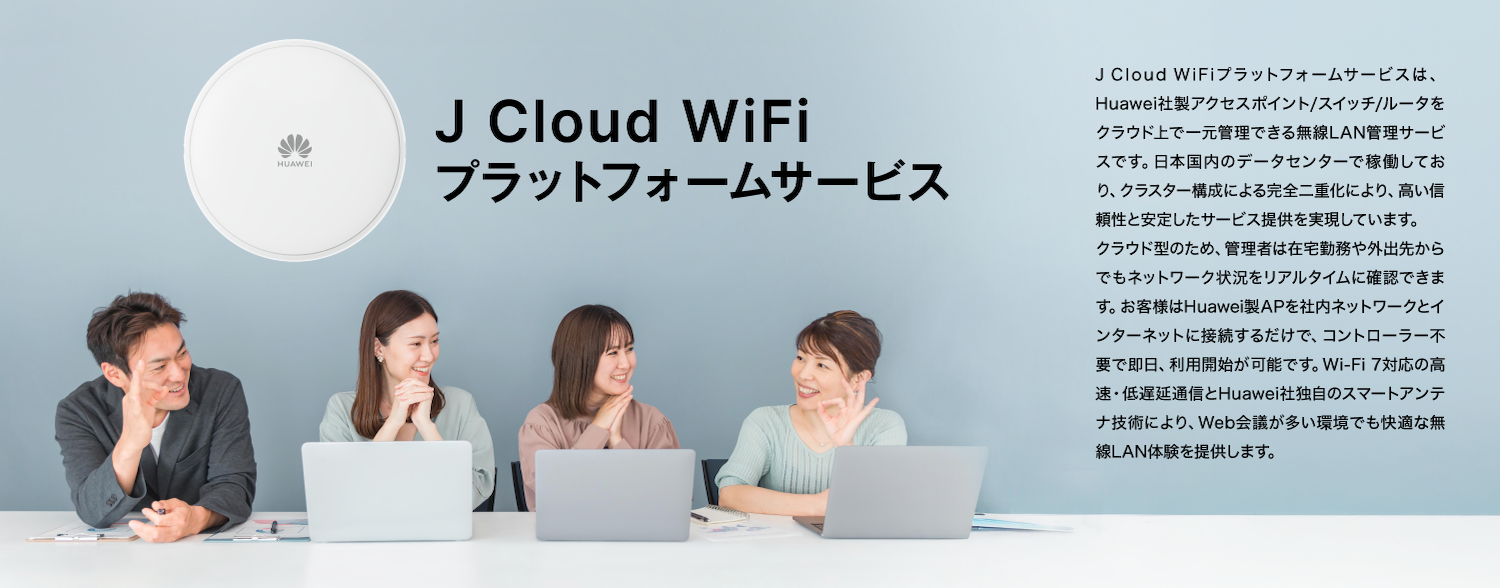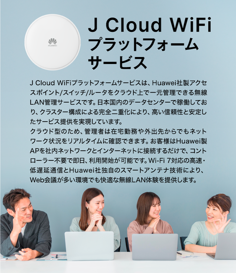 運用・管理プラットフォームHuawei社はクラウドを活用したネットワーク運用・管理にも注力しています。J Cloud WiFiプラットフォームサービスはHuawei社のNCE Campusクラウド管理ソフトウェアを採用しています。在宅勤務が進む環境においても、遠隔からの可視化・運用を可能し、IT管理者の負担を大幅に軽減します。